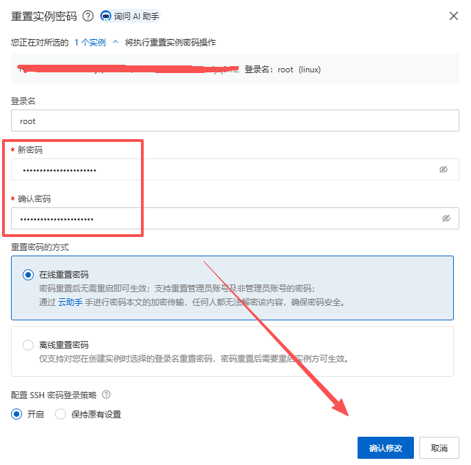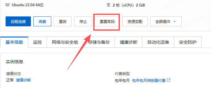 2、如果没有设置或忘记了,以阿里云服务器为例,找到你的服务器(云服务器 ECS/实例),进行重置密码,如图所示: