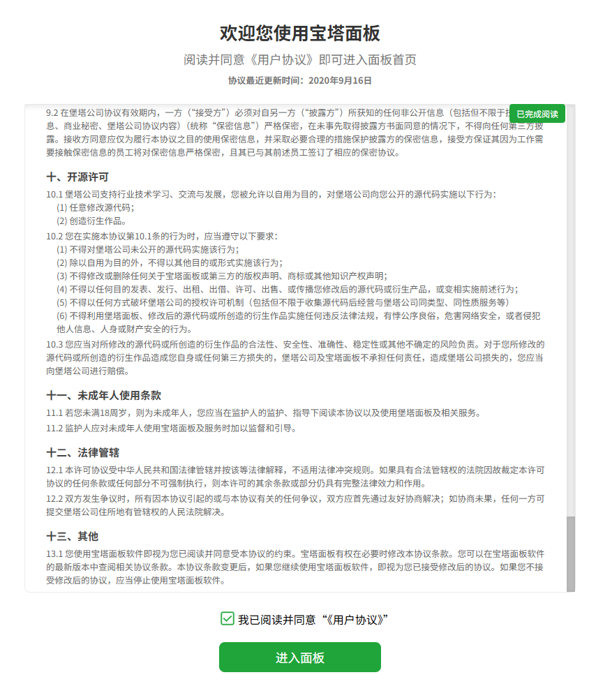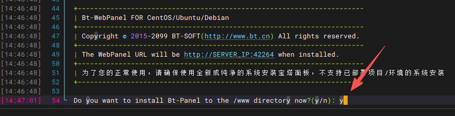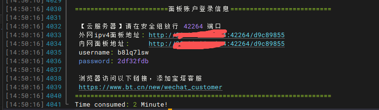 复制以上命令(适用于Ubuntu/Deepin)粘贴到SSH工具里——回车运行——询问是否安装宝塔面板,输入 y 回车,等安装完成,中途无需任何操作,大家可以先去喝一杯奶茶再回来——安装完成后,大家务必复制面板账号信息并保存好,如图所示: