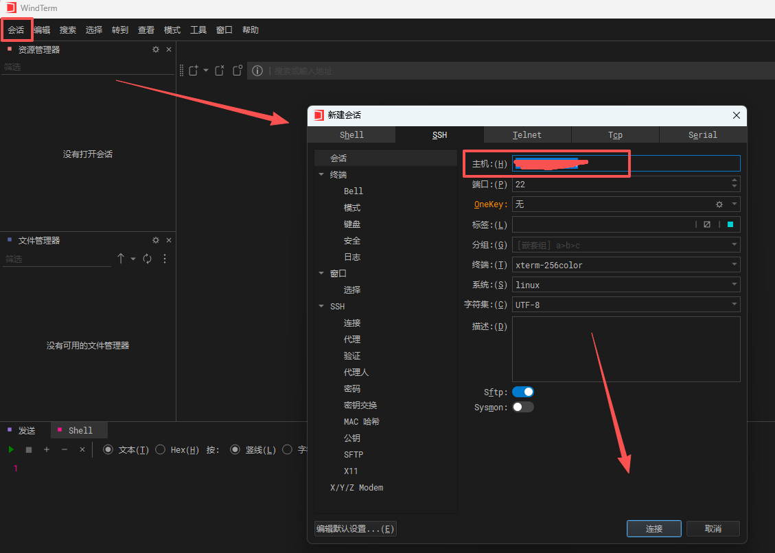 打开WindTerm——会话——新建会话——主机(输入你的服务器IP,即公网IP,其他内容保持默认)——点击连接——用户名(填写:root)——密码(即你的root用户密码)——继续——显示root@xxx#说明登陆成功