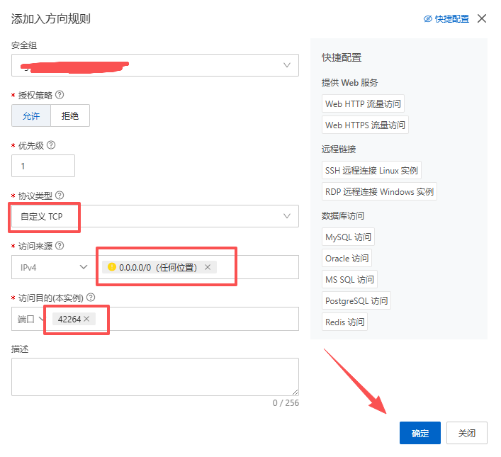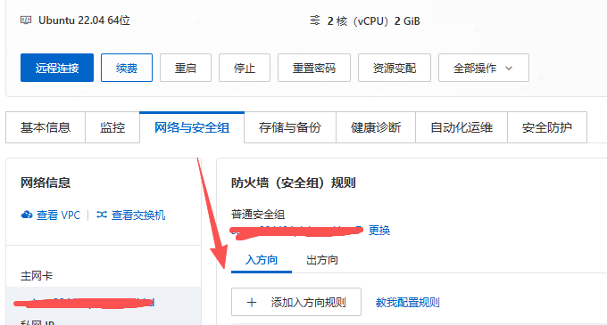 以阿里云为例,你的服务器(云服务器 ECS/实例)——网络与安全组——添加入方向规则——协议类型:自定义TCP,访问来源:IPV4任意,端口填写:你宝塔面板要求放行的端口(比如我的是:42264),确定完成,如图所示: