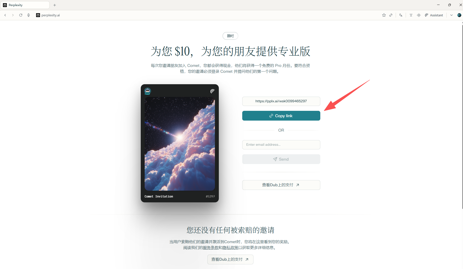 1、点击Comet浏览器底部“邀请与赚取”,获取你的邀请链接;